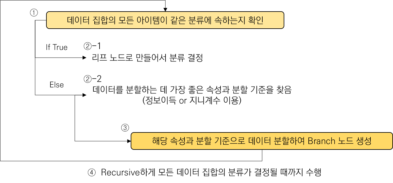- if-else(규칙조건)를 자동으로 찾아내 예측을 위한 규칙을 만드는 알고리즘으로 이해하면 된다.