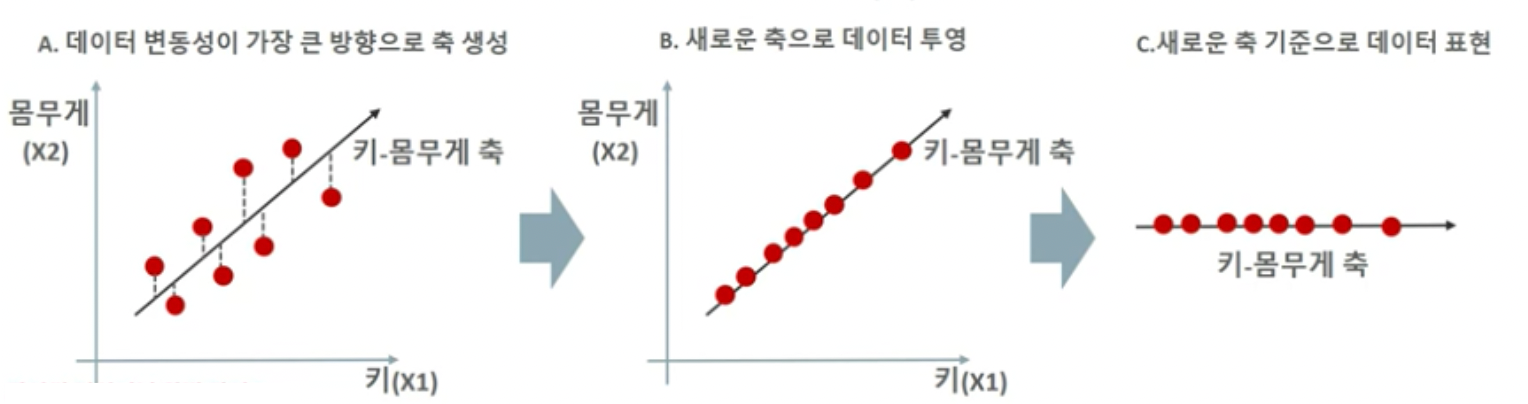 - 고차원의 원본데이터를 저차원의 부분 공간으로 투영하여(Projection) 데이터를 축소하는 기법