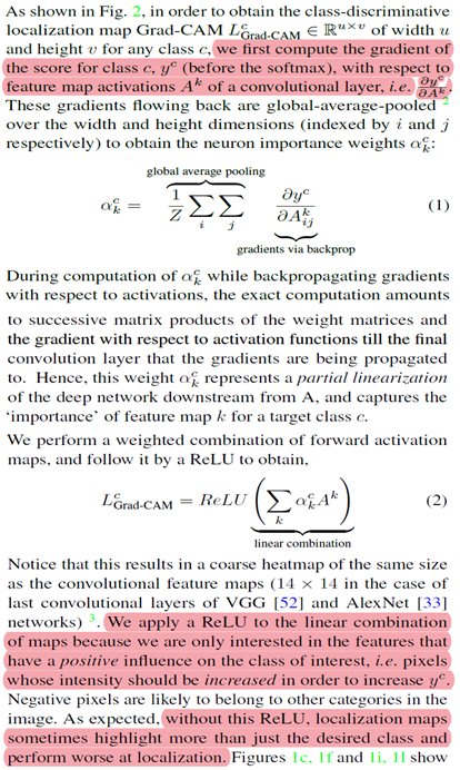 - a^ck의 수식을 글로 풀어 설명해보면, k번째 feature map f_k(i,j)의 각 원소 i,j가 Output class c의 Sc에 주는 영향력의 평균이라고 말할 수 있다.