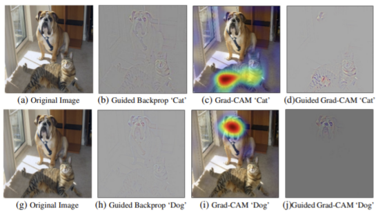 이러한 문제점을 해결하기 위하여 논문에서는 ‘Grad-CAM’에 명확한 이미지 윤곽을 리턴하는 ‘guided backpropagation’의 장점을 접목한 개념을 제시하였다 (Guided Grad-CAM). 따라서, local 한 특성을 보여주는 Grad-CAM과 Specific한 특성을 보여주는 Guided backpropagation을 pixel-wise multiplication하게되면, Local+Specific 특징을 모두 갖는 Guided Grad-CAM을(d, j) 얻을 수 있다.