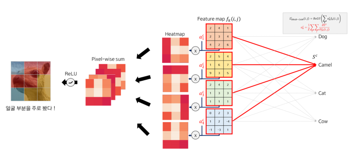 - 그리고 마찬가지로 pixel-wise sum을 한 후, ReLU 함수를 적용해 양의 가중치를 갖는 (중요하게 여기는) 부분을 골라내면 Grad-CAM이 된다.
