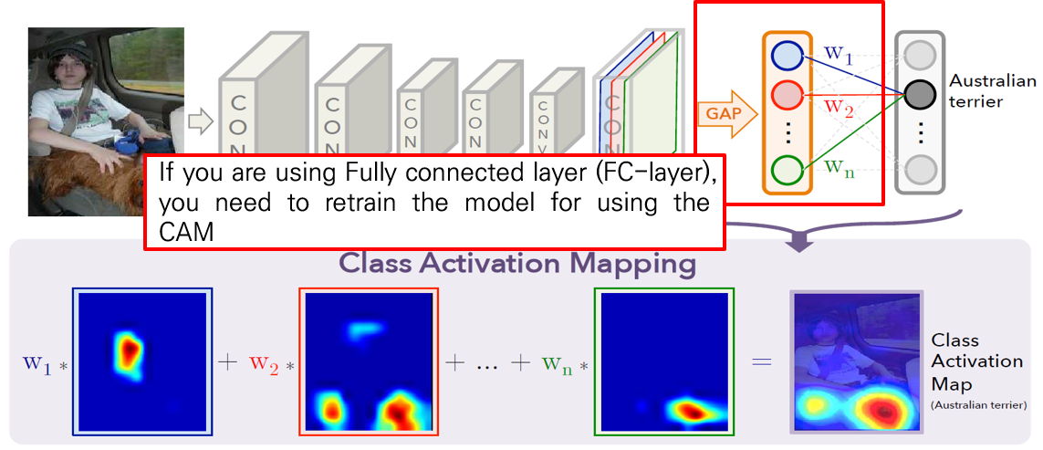 CAM은 간단히 계산할 수 있는 유용한 툴이지만, Global Average Pooling layer를 사용해야만 한다는 한계점을 갖는다. 즉, GAP으로 대치하게되면 뒷부분을 다시 또 fine tuning 해야하는 한계점이 있다. 따라서, 이번 논문에서 제시된 Grad-CAM은 GAP을 쓸 필요가 없다는 점에서(Fully-connected layer 사용가능) 일반화된 CAM (Generalized CAM) 이라고도 말할 수 있다.