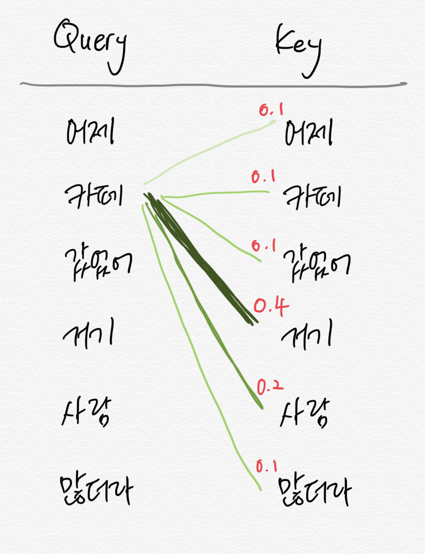 셀프 어텐션은 쿼리 단어 각각을 대상으로 모든 키 단어와 얼마나 유기적인 관계를 맺는지를 그 합이 1인 확률 값으로 나타낸다. 그림을 보면 '카페'라는 쿼리 단어와 가장 관련이 높은 키 단어는 '거기(0.4)'라는 것을 확인할 수 있다.
