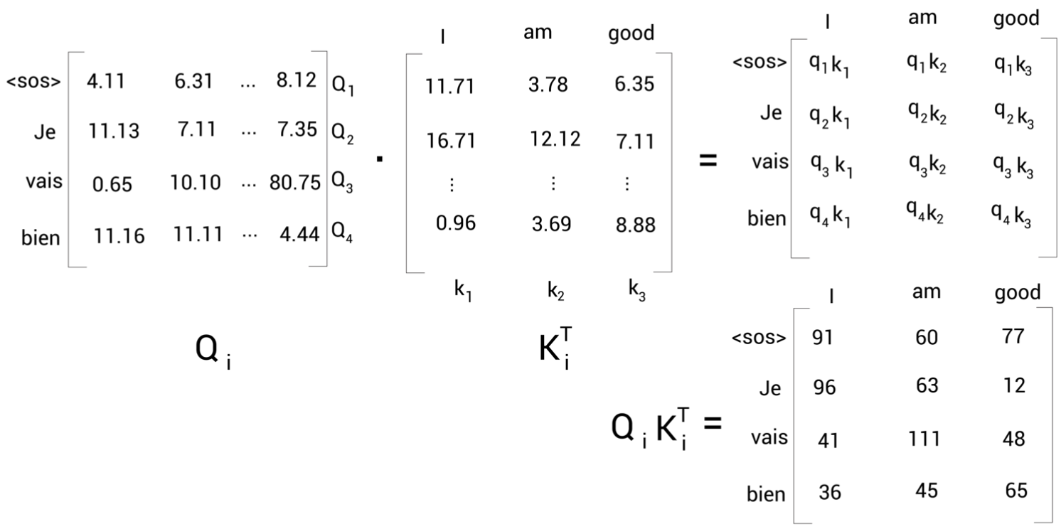 - 행렬의 첫 번째 행에서 쿼리 벡터 q1(<sos>)와 모든 키 벡터 \(k_{1}\)(I), \(k_{2}\)(am), \(k_{3}\)(good) 사이의 내적을 계산하는 것은 내적의 결과로 나온 첫 번째행은 타깃 단어 <sos>가 입력 문장의 모든 단어 (I, am, good)와 얼마나 유사한지를 계산하는 것으로 이해할 수 있다.