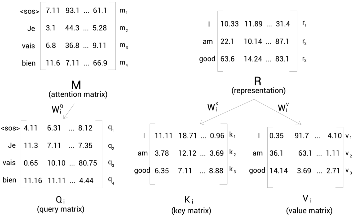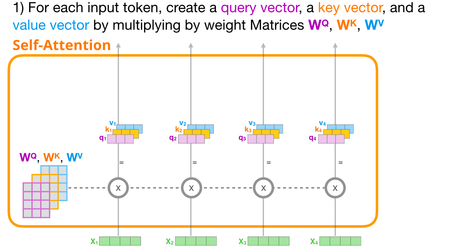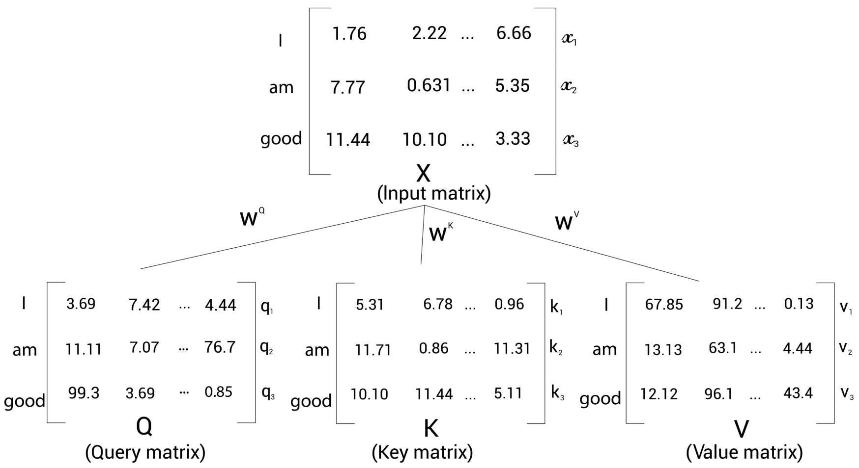 입력행렬(임베딩 행렬) X로 부터 쿼리행렬(Q), 키행렬(K), 벨류행렬(V)를 생성한다. 쿼리(Q), 키(K), 벨류(V) 행렬은 \(W^{Q}\), \(W^{K}\), \(W^{V}\)라는 3개의 가중치 행렬(weight matrix)을 생성한 다음 이 가중치 행렬을 입력행렬 (X)에 곱해 Q, K, V를 생성한다. \(W^{Q}\), \(W^{K}\), \(W^{V}\)는 처음에 임의의 값을 가지며, 학습 과정에서 최적을 값을 얻는다. 학습을 통해 최적의 가중치 행렬값이 생성되면 더욱 정확한 쿼리 값, 키값, 밸류 값을 얻게 된다.