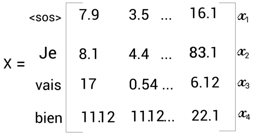 - 시간 스텝 t=1이라면 디코더의 입력은 문장의 시작을 알리는 <sos>를 입력받고 타깃 문장으로 첫 번째 단어인 'Je'를 생성한다.