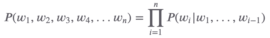 전체 단어 시퀀스가 나타날 확률(다음 수식 좌변)은 이전 단어들이 주어졌을 때 다음 단어가 등장할 확률의 연쇄(다음 수식 우변)와 같다고 할 수 있으며, 이 때문에 언어 모델을 이전 단어들이 주어졌을 때 다음 단어가 나타날 확률을 부여하는 모델이라고 정의하기도 한다.
