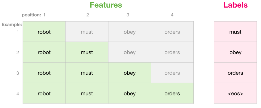 ★ (모델 학습의 경우) 이러한 마스킹 과정을 순서대로 할 필요없이 한꺼번에 수행할 수 있다(Do not need to be done sequentially, but can be done at one batch). 즉, 'robot must obey orders'라는 문장을 학습하기 위해 순서대로(sequential) 4번의 마스킹 계산을 수행할 필요없이 한 번에(batch) 마스킹 처리하여 loss를 구할 수 있다.