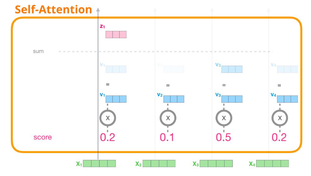 셀프 어텐션 모듈은 이러한 결과에 벨류 벡터들을 가중합하는(weighted sum) 방식으로 계산을 마무리한다.