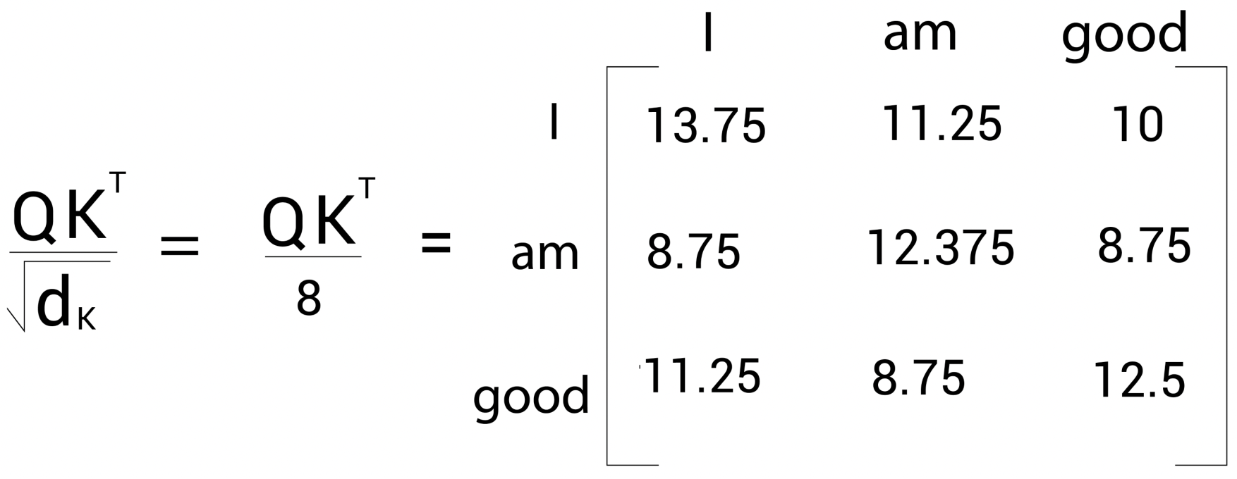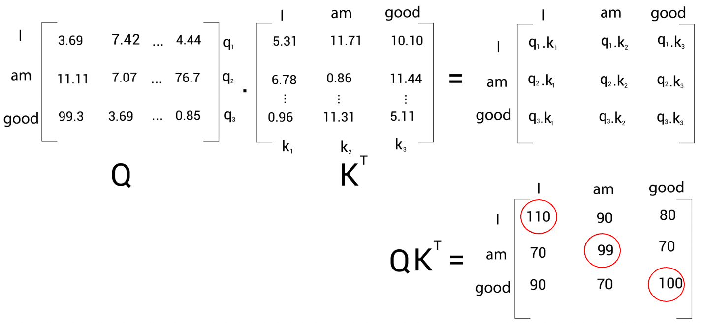 쿼리 벡터 (\(q_{1}\)(I))와 키 벡터 (\(k_{1}\)(I), \(k_{2}\)(am), \(k_{3}\)(good)) 사이의 내적을 계산하는 것은 쿼리 벡터 \(q_{1}\)(I)과 키 벡터 \(k_{1}\)(I), \(k_{2}\)(am), \(k_{3}\)(good) 사이의 유사도를 계산한 것이다(→ 쿼리 행렬과 키 행렬 사이의 내적을 계산하면 유사도를 얻을 수 있다). 즉, \(Q·K^{T}\) 행렬의 첫 번 째행을 보면 내적 값을 기준으로 단어 'I'는 단어 'am'과 'good'보다 자신(I)과 연관성이 더 높은 것을 알 수 있다.