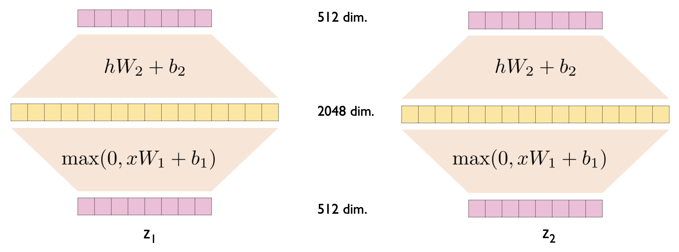 $$ FFN(x) = max(0,xW_{1} + b_{1})W_{2} + b_{2} $$