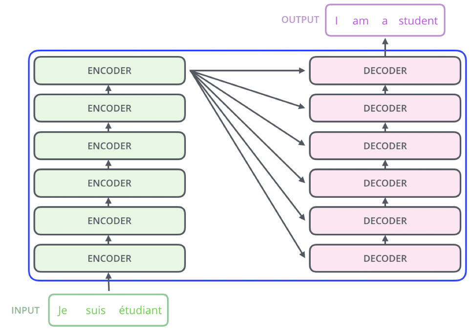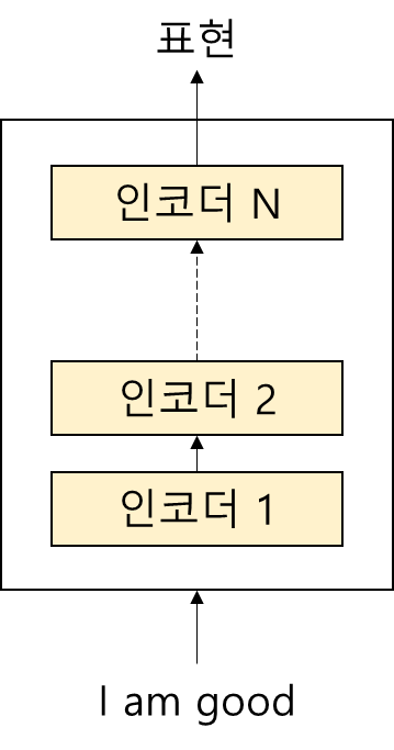 최초 인코더에 대한 입력값으로 입력 문장을 넣게되고, 최종 인코더의 결괏값으로 입력 문장에 따르는 표현 결과를 얻는다. "Attention Is All You Need" 논문에서는 N=6으로 정의되어 있다(논문 상에서는 인코더 및 디코더가 각각 6개씩 쌓여있으나(stack) 특정한 이유가 존재하는 것은 아니다).