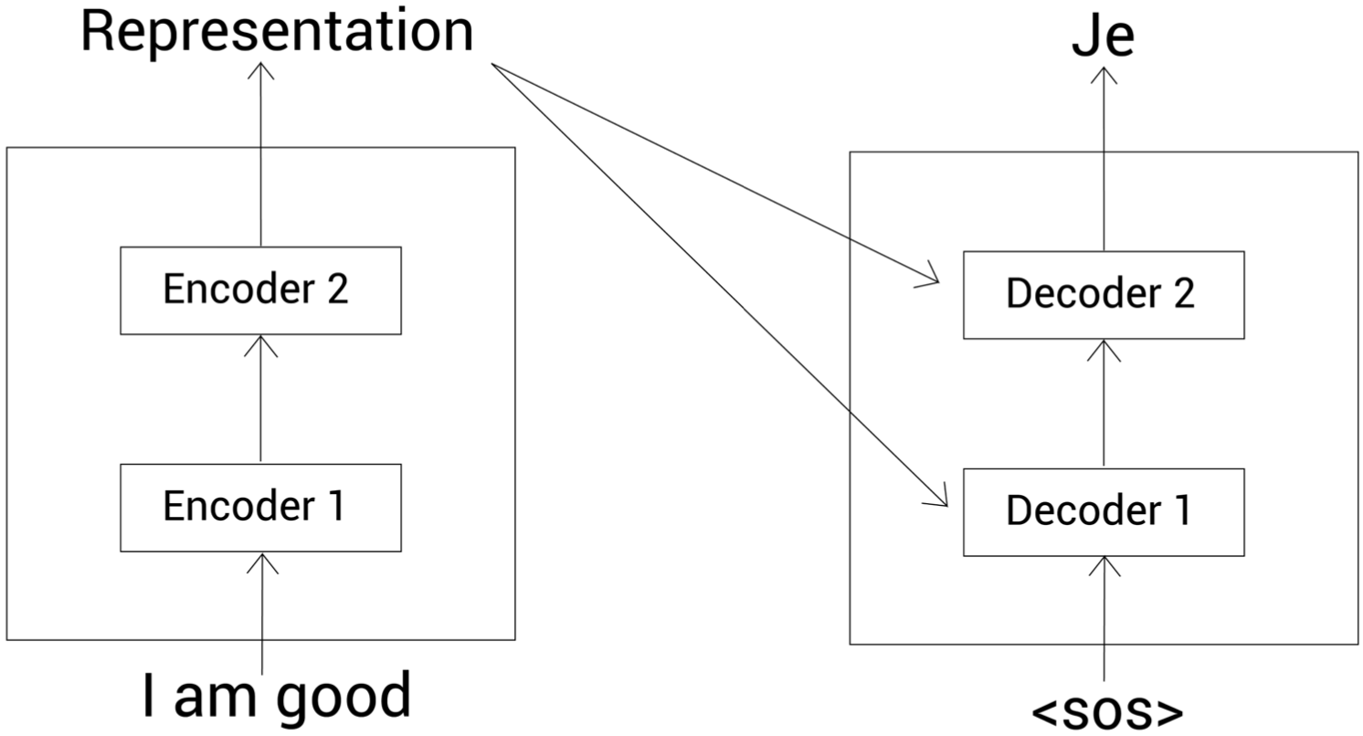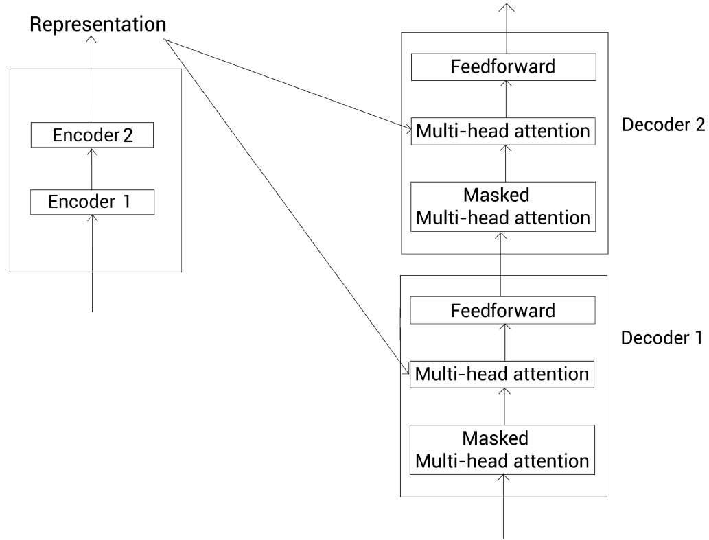 - 인코더의 입력 문장 표현(인코더의 출력값, Representation)이 모든 디코더에 전송된다. 즉, 디코더는 이전 디코더의 입력값과 인코더의 표현(인코더의 출력값) 2개를 입력 데이터로 받는다.