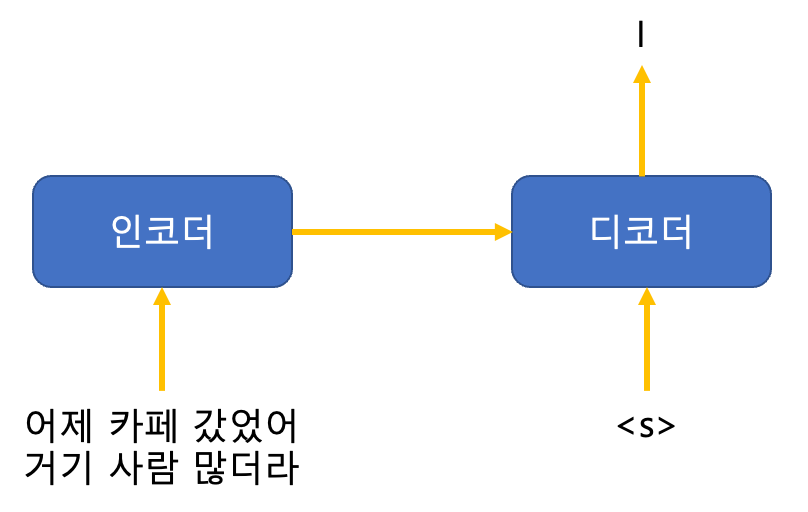 ① 인코더 입력은 어제, 카페, 갔었어, 거기, 사람, 많더라 같이 소스 시퀀스 전체이고 디코더 입력은 <s>가 된다.