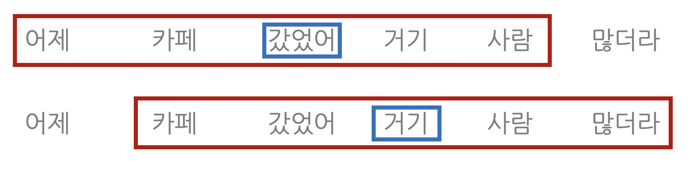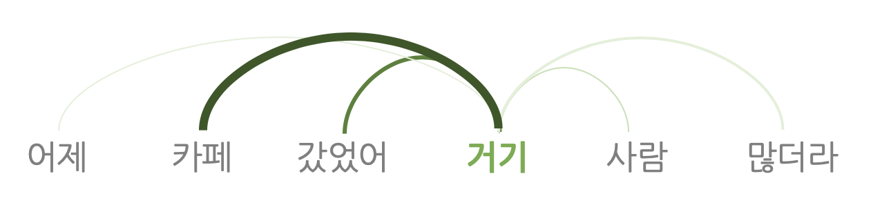 아래 그림은 입력 시퀀스가 '어제, 카페, 갔었어, 거기, 사람, 많더라'일 때 '거기'라는 단어가 어떤 의미를 가지는지 계산하는 상황