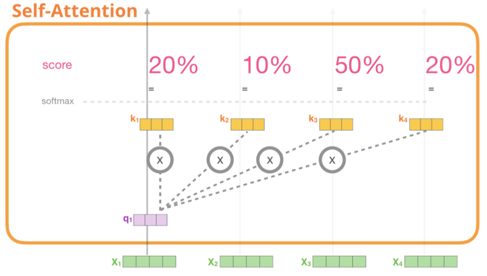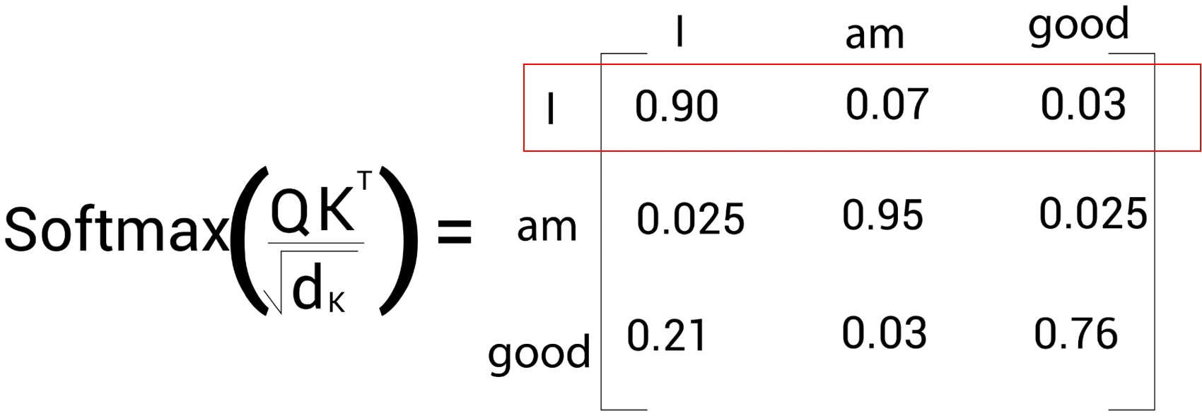 이러한 행렬을 스코어 행렬이라고 한다. 위 점수를 바탕으로 문장 내에 있는 단어가 문장에 있는 전체 단어와 얼마나 연관되어 있는지 알수 있다. 예를 들어 스코어 행렬의 첫 행을 보면 단어 'I'는 자기 자신과 90%, 'am'과는 7% 'good'과는 3% 관련 되어 있다는 것을 알 수 있다.