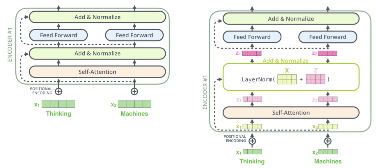 각 인코더 및 디코더의 하위 계층(셀프 어텐션, FFN)은 학습 성능을 끌어 올리기 위해 잔차연결(residual connection) 및 층 정규화(layer-normalization)를 수행한다.