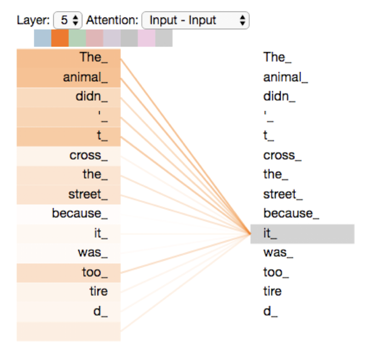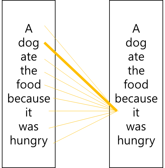 이 문장에서 'it'은 'dog'나 'food'를 의미할 수 있다. 하지만 문장을 자세히 살펴보면 'it'은 'food'가 아닌 'dog'를 의미한다는 것을 쉽게 알 수 있다. 위와 같은 문장이 주어질 경우 모델은 'it'이 'food'가 아닌 'dog'이라는 어떻게 알 수 있을까? 이 때 셀프 어텐션이 필요하다.