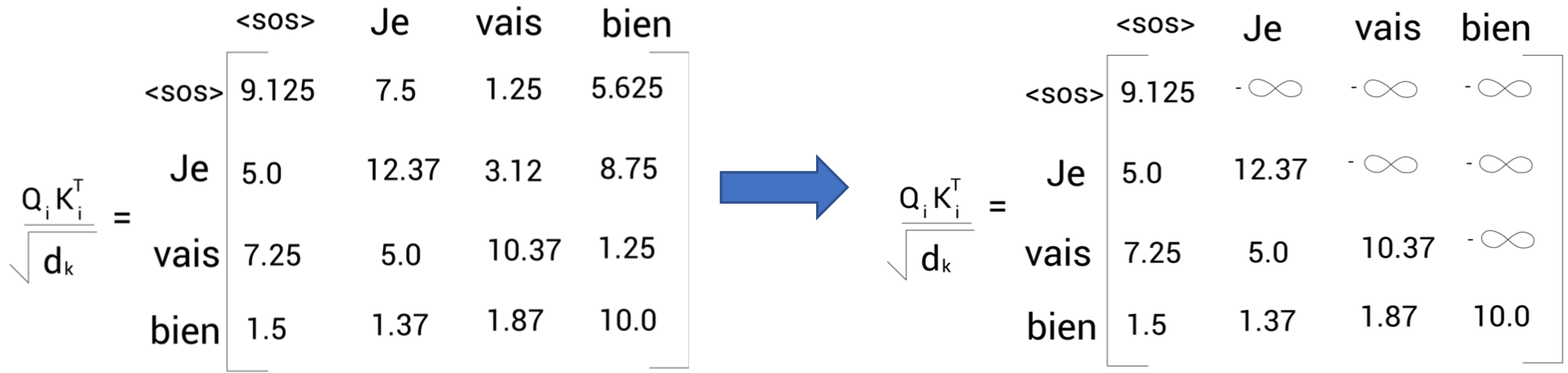 위 계산 과정에서 소프트맥스 함수를 적용하기 전에 행렬값에 대한 마스킹 처리가 필요하다. 예를 들어 <sos>의 다음 단어를 예측한다고 할 때 모델에서는 <sos> 오른쪽에 있는 모든 단어를 참조하지 말아야 한다. 따라서 <sos> 오른쪽에 있는 모든 단어를 -∞로 마스킹을 수행한다. 즉, 마스킹은 소프트맥스 확률이 0이 되도록 하여, 밸류와의 가중합에서 해당 단어 정보들이 무시되게끔 하는 방식으로 수행된다.
