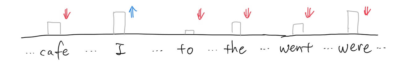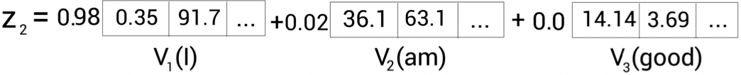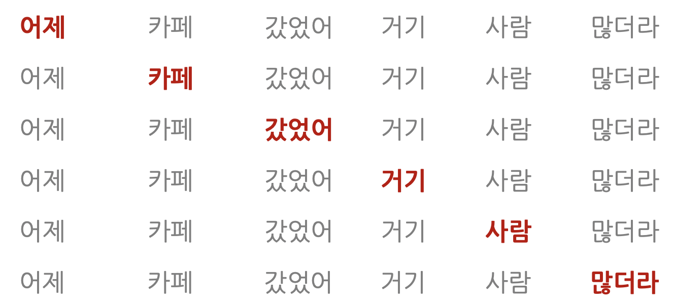 𝐙(카페) = 0.1×𝐕(어제)+0.1×𝐕(카페)+0.1×𝐕(갔었어)+0.4×𝐕(거기)+0.2×𝐕(사람)+0.1×𝐕(많더라)
