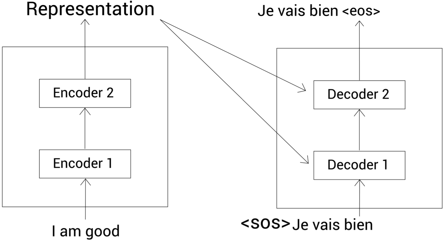 'I am good'을 'Je vais bien'으로 번역한다고 가정할 때 타깃 문장 시작 부분에 <sos> 토큰을 추가한 '<sos> Je vais bien'을 디코더에 입력하면 디코더에서 'Je vais bien <eos>'를 출력한다.