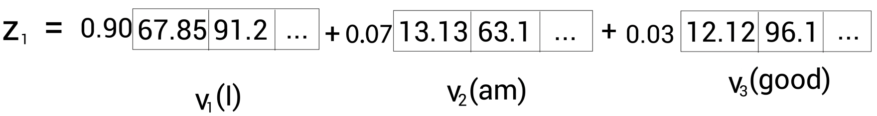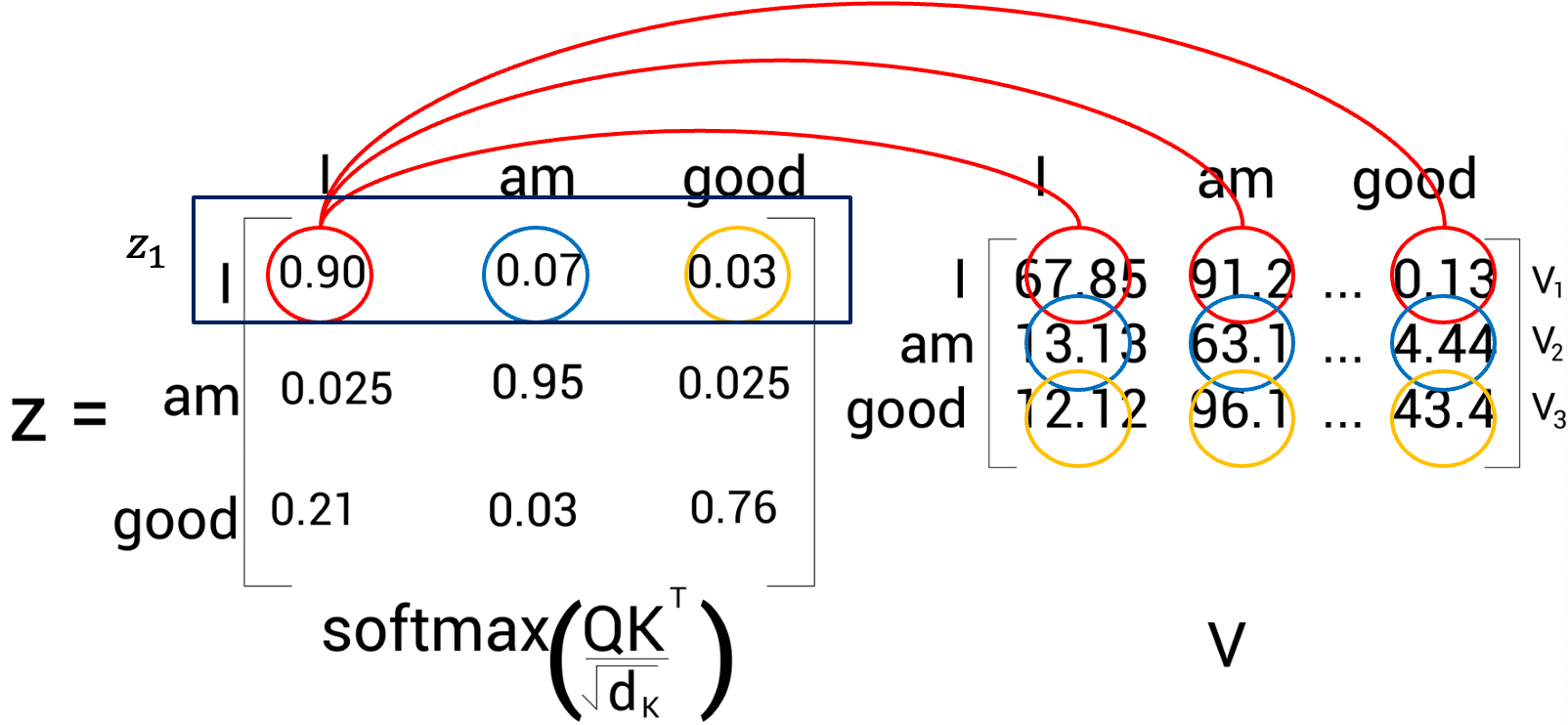 마지막 과정은 어텐션(Z)을 계산하는 것이다. 예를 들어 단어 'I'의 셀프 어텐션 \(z_{1}\)은 각 벨류 벡터값의 가중치 합으로 계산된다. 즉, \(z_{1}\)의 값은 벨류 벡터 \(v_{1}\)(I)의 90% 값과(→I는 \(v_{1}\)이 90% 반영) 벨류 벡터 \(v_{2}\)(am)의 7%값과(→I는 \(v_{2}\)가 7% 반영) 벨류 벡터 \(v_{3}\)(good)의 3% 값의(→I는 \(v_{3}\)가 3% 반영) 합으로 구한다.