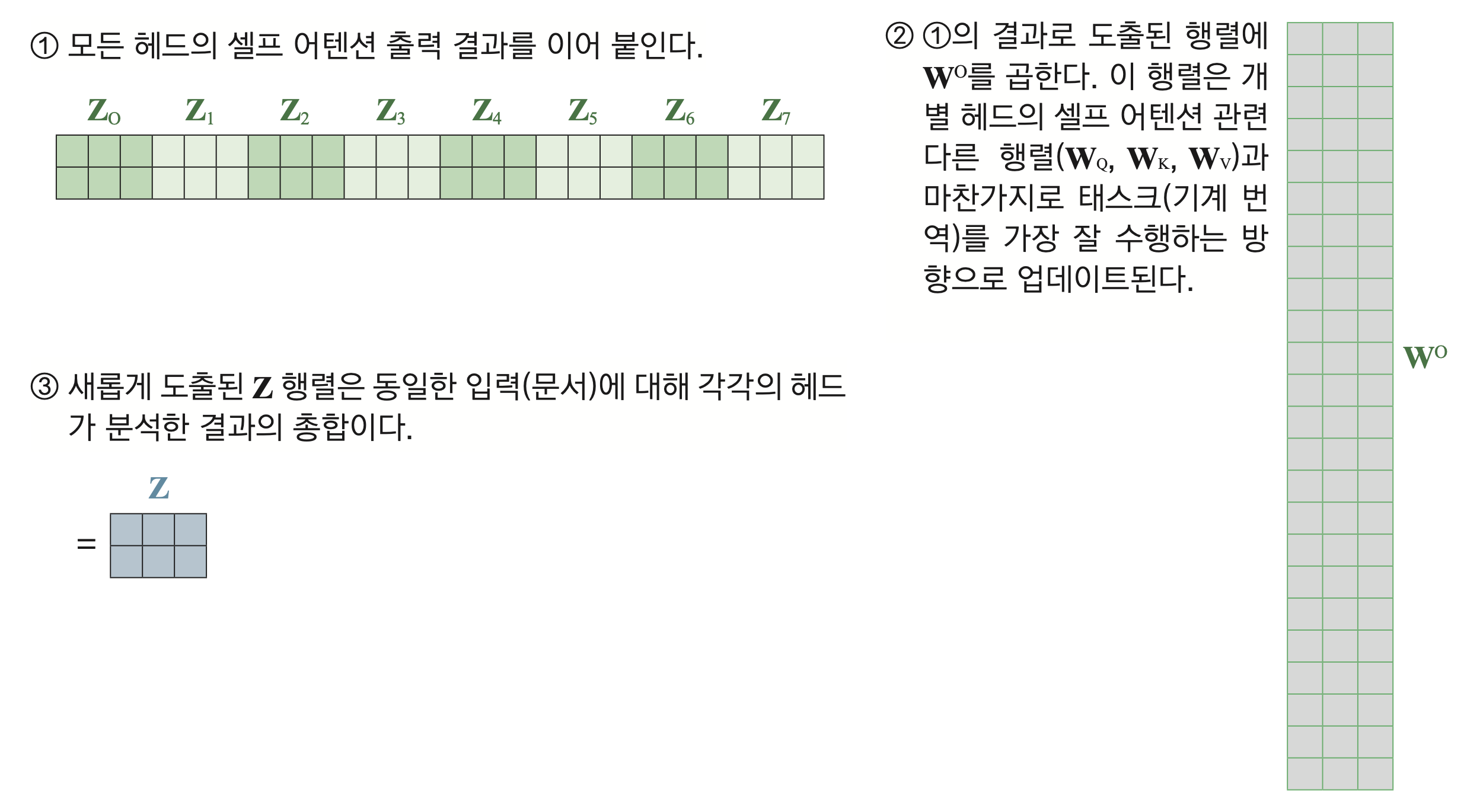 멀티 헤드 어텐션 = concatenate(\(Z_{1}\), \(Z_{2}\), \(Z_{3}\), ..., \(Z_{8}\))·\(W_{0}\) (→ 2X24 * 24X3)