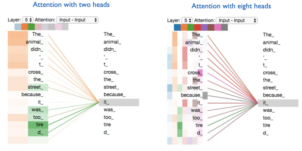 어텐션 결과의 정확도를 높이기 위해서 단일 헤드 어텐션 행렬(single head attention)이 아닌 멀티 헤드 어텐션(multi-head attention)을 사용한 후 그 결괏값을 더하는 형태로 진행한다. 이와 같은 방법을 사용하는 데는 단일 헤드 어텐션을 사용하는 것보다 멀티 헤드 어텐션을 사용하면 좀 더 정확하게 문장의 의미를 이해할 수 있다는 가정이 깔려 있다. (* 헤드를 여러개 사용해 어텐션을 생성할 경우 단일 헤드를 사용하는 경우보다 오분류가 일어날 위험을 줄이는 것으로 해석할 수 있다.)