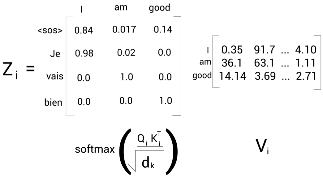 i 헤드의 어텐션 행렬 \(Z_{i}\)는 다음 식으로 구할 수 있다. (i는 헤드 넘버)