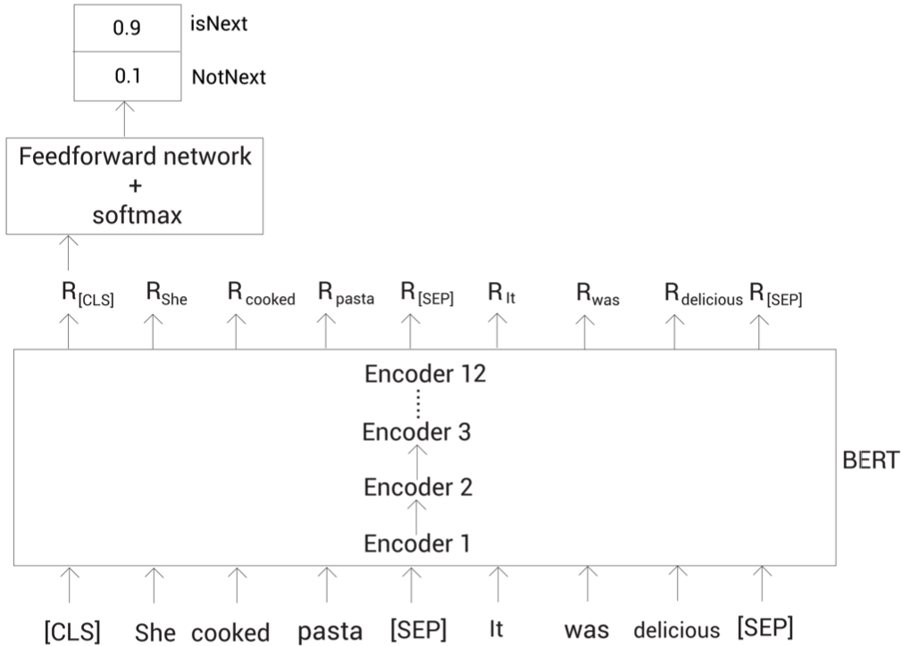 NSP 태스크를 수행함으로써 모델은 두 문장 사이의 관계를 파악할 수 있으며, 두 문장 간의 관계를 이해하는 것은 질의응답 및 유사문장탐지와 같은 다운스트림 태스크에서 유용하다. 분류를 수행하려면 간단히 [CLS] 토큰 표현을 가져와 소프트맥스 함수를 사용해 프드포워드 네트워크에 입력한다. 그러면 문장 쌍이 isNext인지, notNext인지에 대한 확률값이 반환된다.