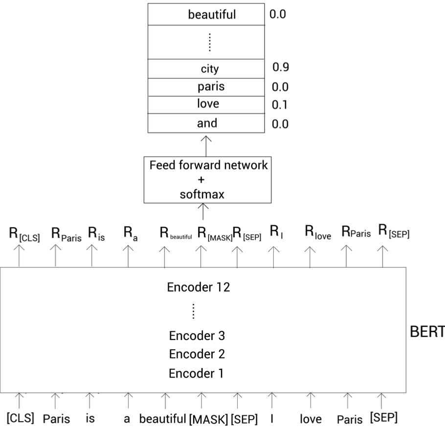 - 아래 그림과 같이 마스크 된 토큰 R[MASK]의 표현을 피드포워드+소프트맥스 네트워크에 전달하면, R[MASK]에 위치할 가장 적합한 단어에 대한 확률분포를 확인 할 수 있다. 따라서 'city'라는 단어가 마스크 된 단어일 확률이 높다.