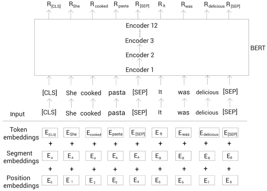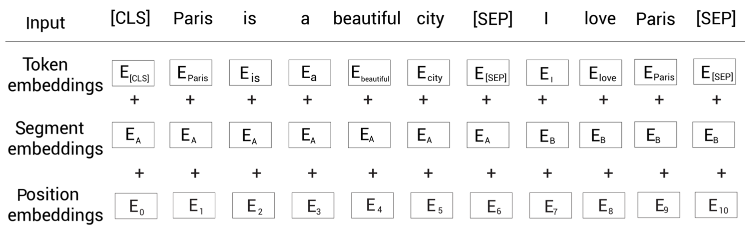 위와 같은 토큰화 과정을 수행 후 문장 시작 부분에 [CLS] 토큰과 끝 부분에 [SEP] 토큰을 추가하고 앞서 언급한 세 가지 임베딩 과정을 수행한다.