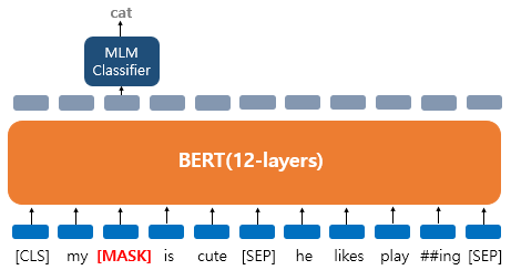 예시를 통해 이해해보자. 'My dog is cute. he likes playing'이라는 문장에 대해서 마스크드 언어 모델을 학습하고자 한다. 약간의 전처리와 BERT의 서브워드 토크나이저에 의해 이 문장은 ['my', 'dog', 'is' 'cute', 'he', 'likes', 'play', '##ing']로 토큰화가 되어 BERT의 입력으로 사용된다. 그리고 언어 모델 학습을 위해서 'dog' 토큰이 [MASK]로 데이터가 변경 되었다고 가정한다.