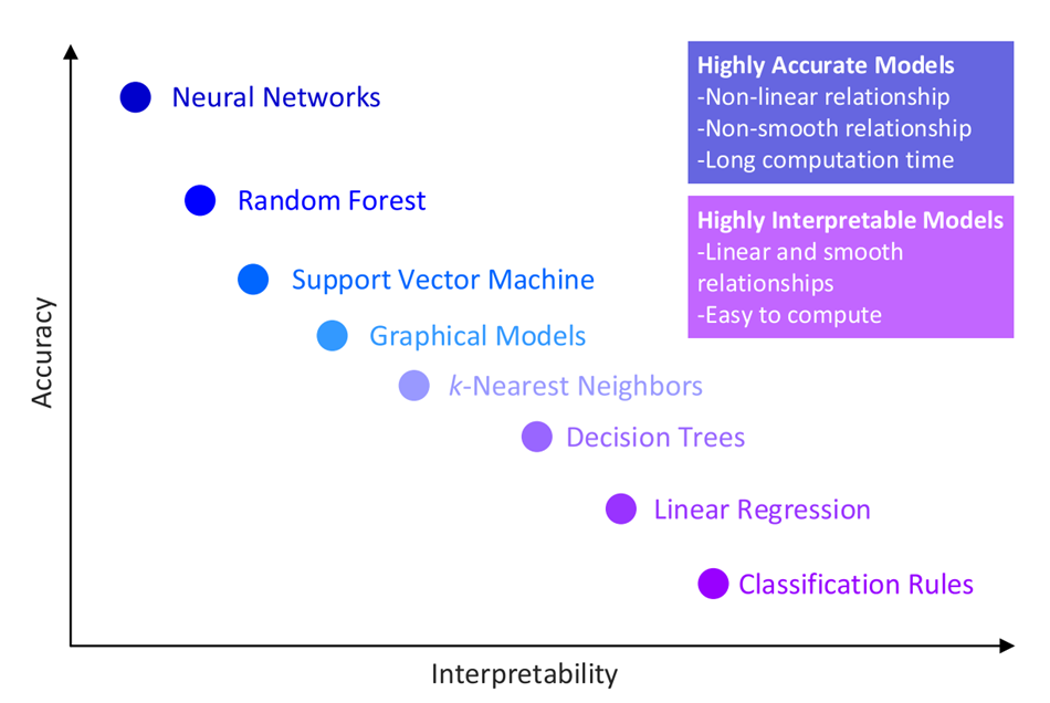 모델의 복잡성 (Complexity)은 해석력과 깊은 연관이 있다. 모델이 복잡할수록 사람이 해석하기가 더 어려우며, 반대로 모델이 단순할수록 사람이 해석하기는 더 용이하다. 그러나 어려운 문제를 해결하기 위해서는 복잡한 구조가 (ex. DNN) 유리하기 때문에 모델의 복잡성과 해석력은 서로 Trade-off 관계가 있다.