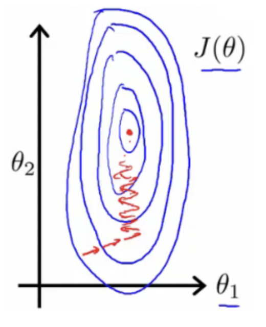 - 해당 feature 값의 범위에서 생성된 손실함수의 등고선을 분석해보면 큰 범위 차이로 인해 세로로 크고 얇은 모양을 나타낸다.